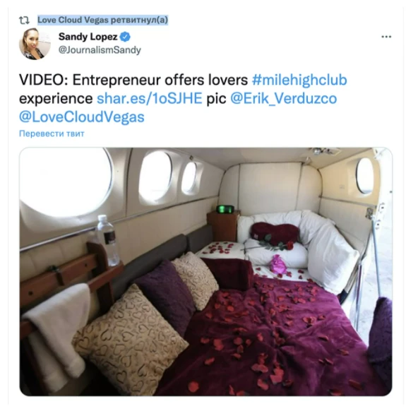 Hãng hàng không Love Cloud của Mỹ cung cấp dịch vụ cho phép các cặp vợ chồng quan hệ tình dục trên không. Ảnh: TWITTER