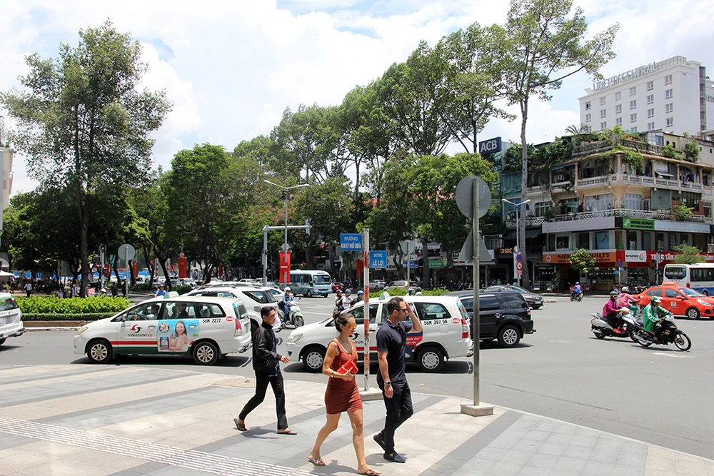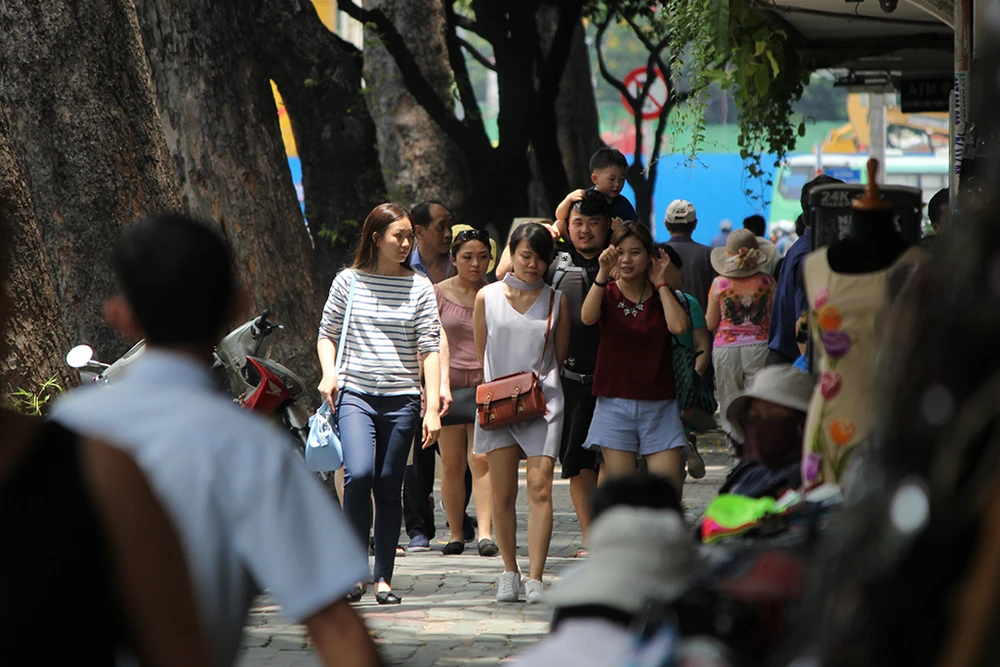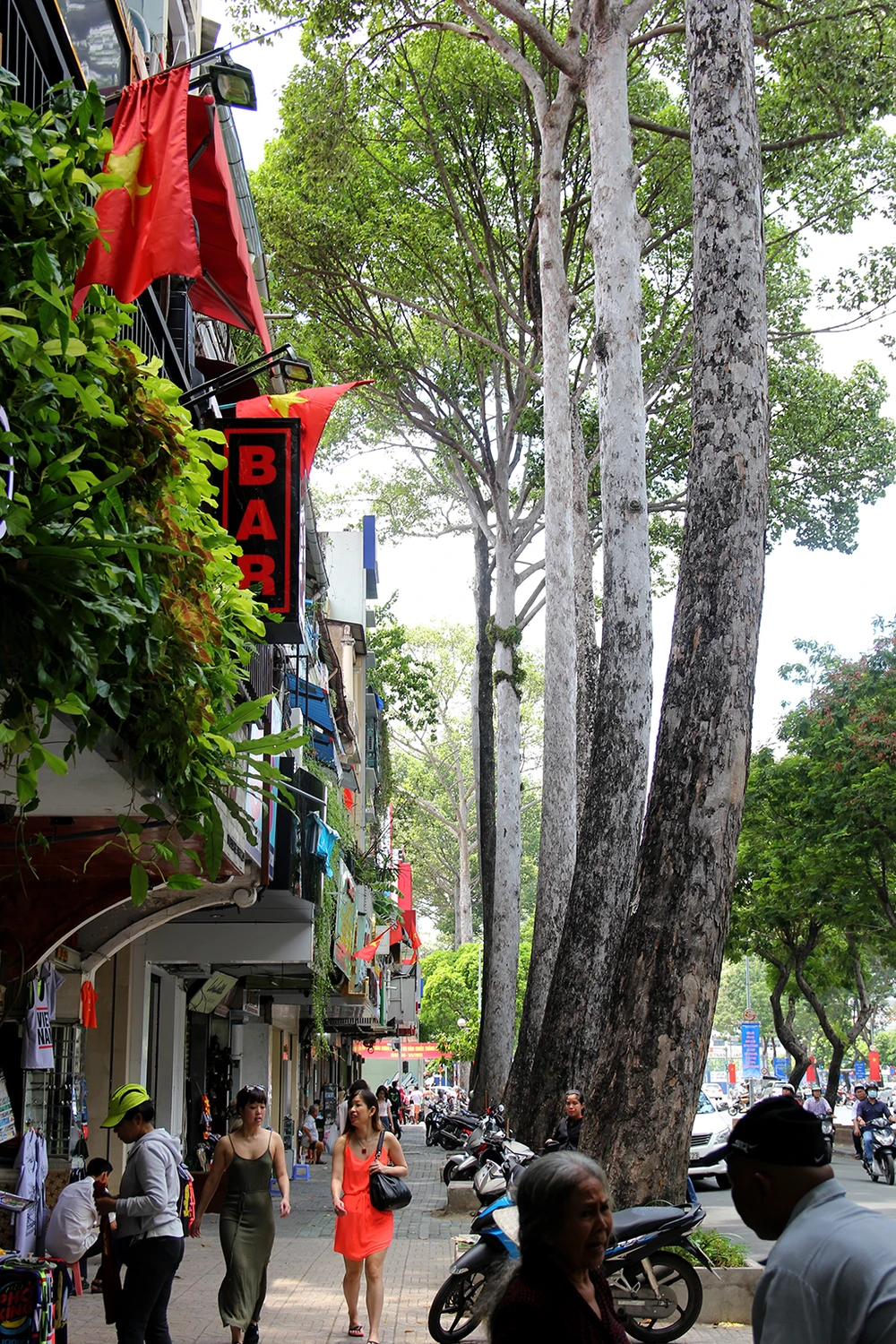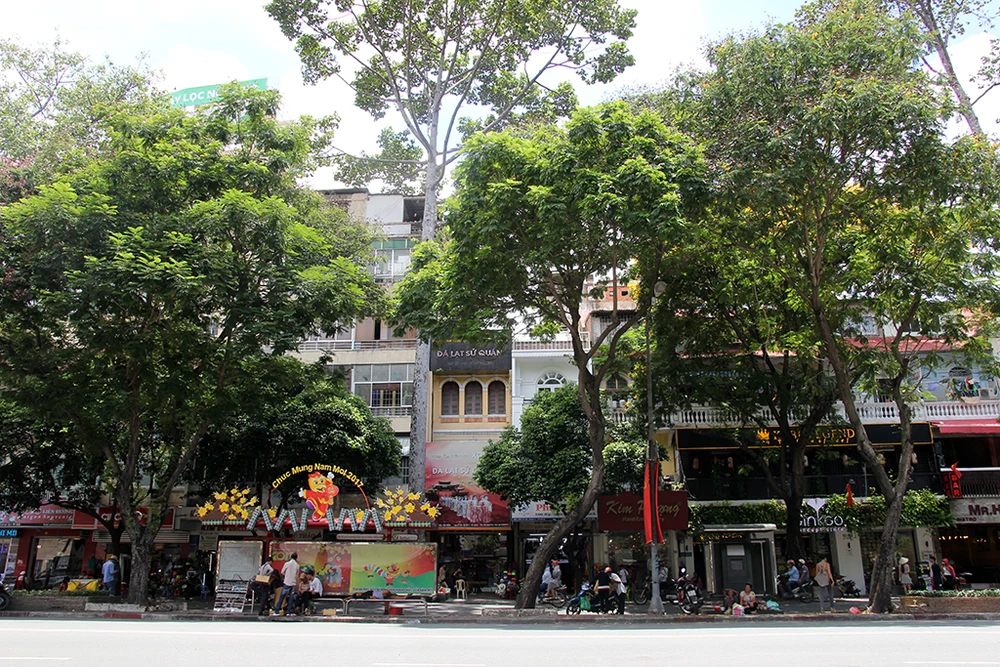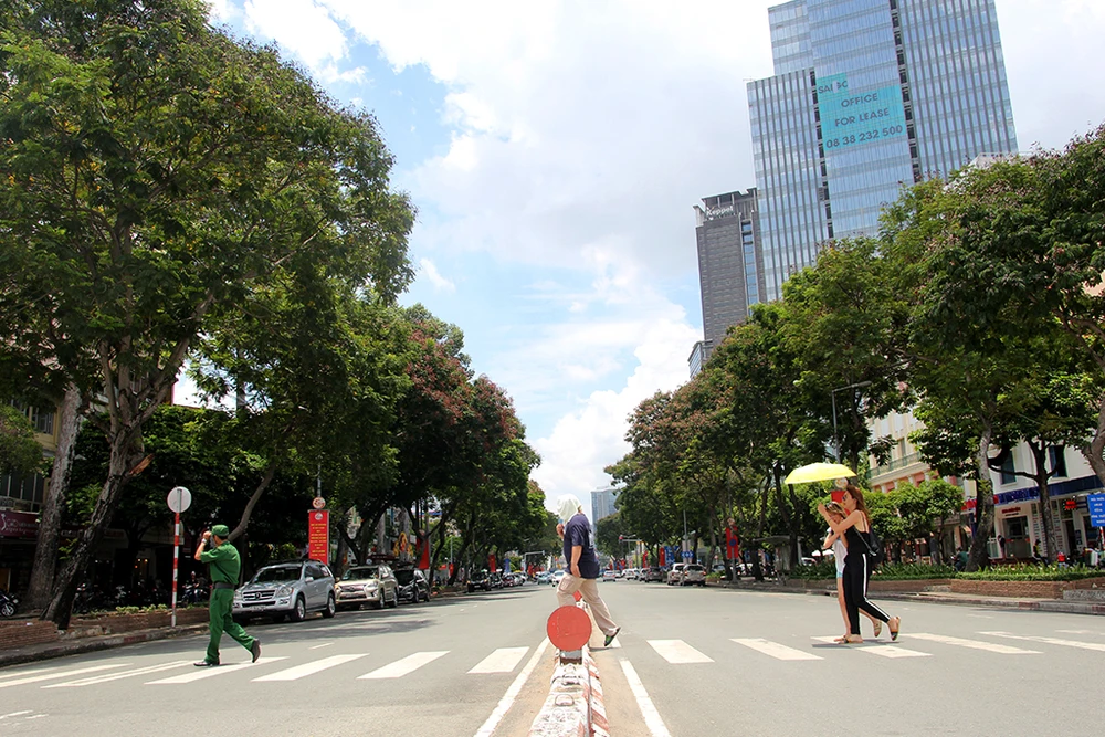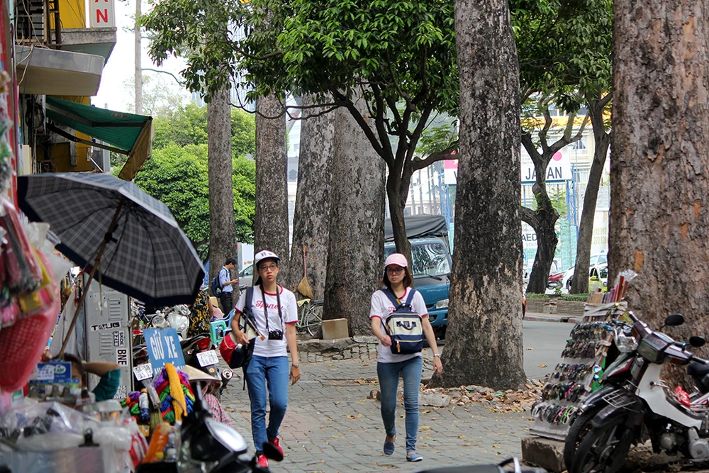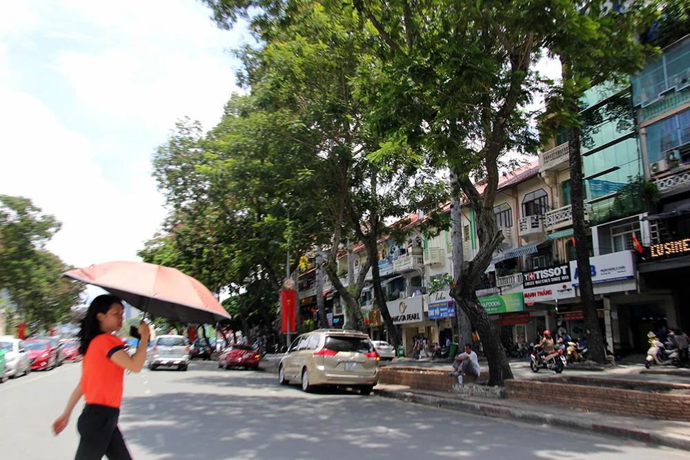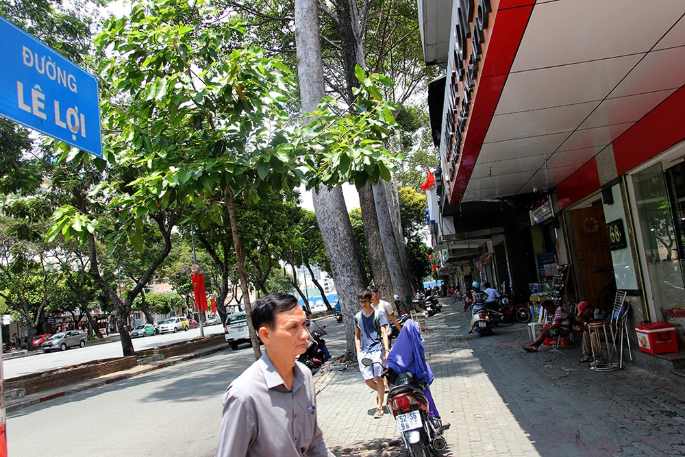Người dân và khách du lịch đi bộ dưới bóng mát của hàng cây cổ thụ trên đường Lê Lợi.