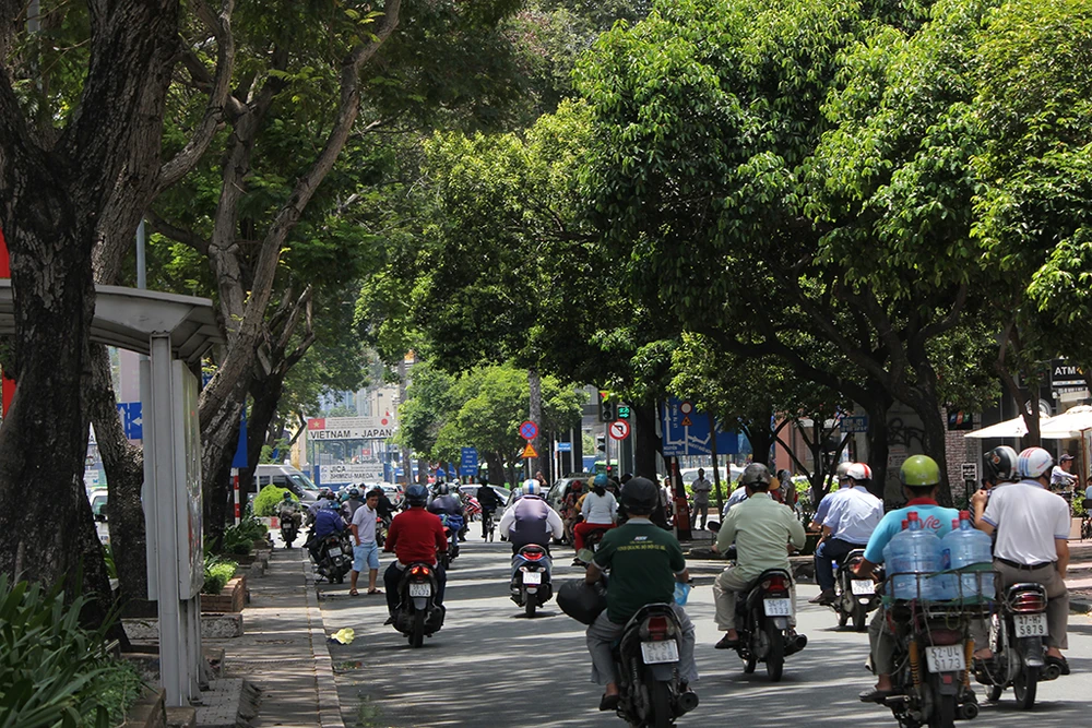 Người dân chờ đèn giao thông dưới bóng mát của hàng cây xanh.