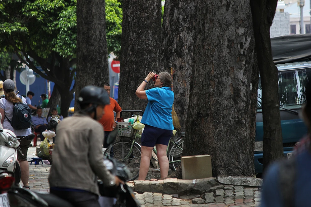 Một du khách nước ngoài chụp ảnh hàng cây cổ thụ.