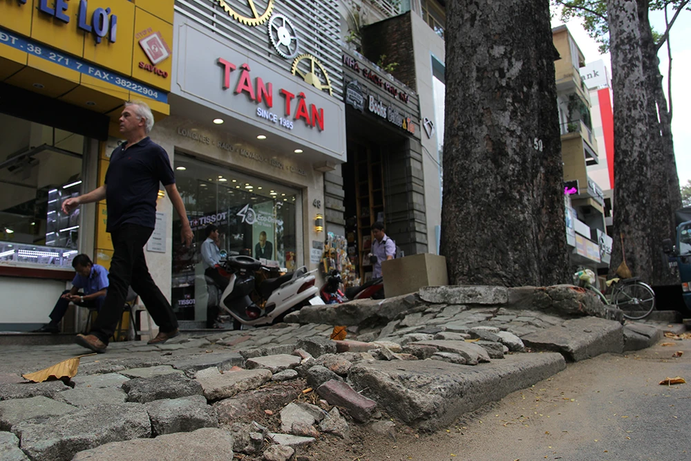 Phần rễ cây cổ thụ trồi lên làm hư hỏng phần vỉa hè đi bộ.
