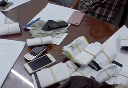 Hàng trăm triệu đồng cùng nhiều trang thiết bị phục vụ cá độ bóng đá bị công an thu giữ (ảnh do công an cung cấp).