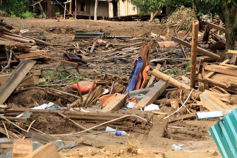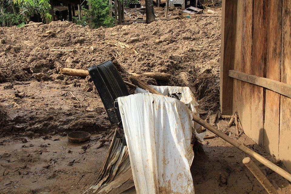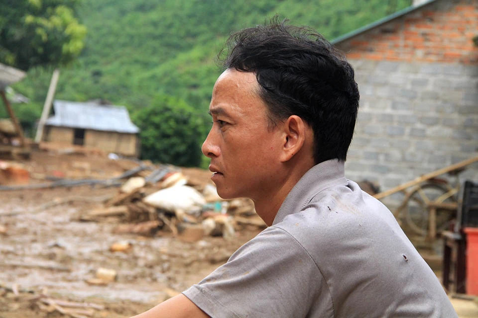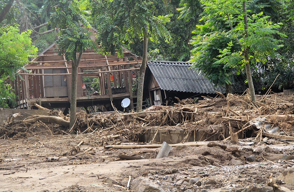 Những hộ gia đình ở sát vách núi thiệt hại nặng nề khi lũ tràn quét qua từng ngôi nhà rồi bất ngờ đổ ập xuống.