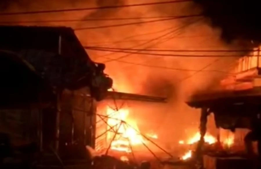 Đám cháy bùng phát lúc nửa đêm lan nhanh và bao trùm hàng chục căn kiot. Ảnh: Người dân cung cấp