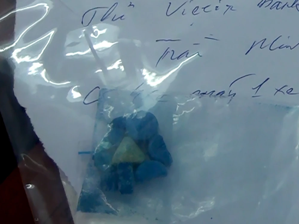 Tại hiện trường, công an phát hiện một số bịch ma túy tổng hợp, viên nén màu hồng, dụng cụ hút ma túy.