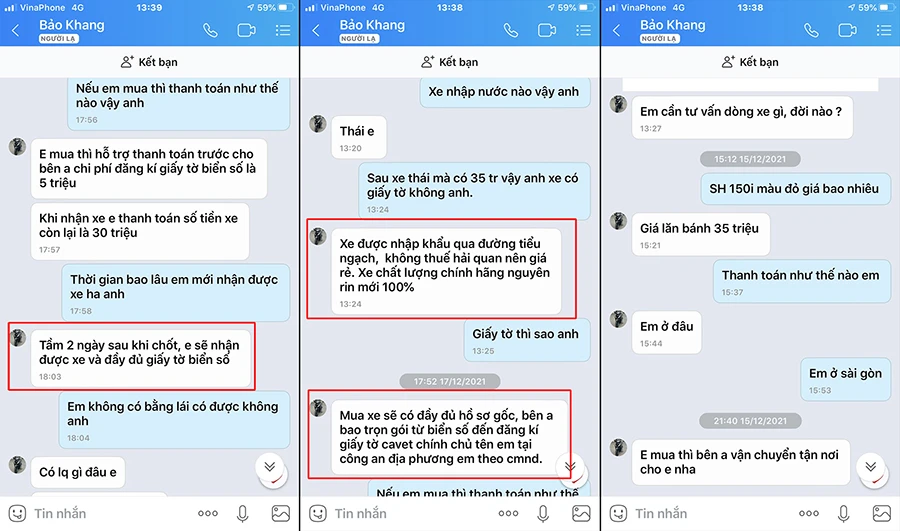 | Hàng loạt nạn nhân sập bẫy Các nạn nhân bị lừa khi mua xe qua fanpage “Xe máy nhập khẩu Bảo Khang” trên Facebook đã lập một nhóm chat gồm nhiều nạn nhân. Ngoài anh Đ và chị Ý còn có hàng loạt người nhẹ dạ khác cũng bị lừa khi mua xe qua fanpage này. Chẳng hạn anh Huỳnh Văn Huy (huyện Nhơn Trạch, Đồng Nai) cũng bị lừa 25 triệu đồng khi mua xe Wave nhập khẩu từ Thái Lan được rao bán với giá 15 triệu đồng. Trong đó, 15 triệu đồng tiền xe và 10 triệu đồng tạm ứng làm giấy tờ. Sau khi chuyển khoản, phía Bảo Khang chặn hoàn toàn liên lạc với anh Huy. Anh Nguyễn Chí Lâm (phường Tam Bình, TP Thủ Đức) mua xe AB150 2021 với giá 18 triệu đồng và anh Lâm cũng bị chặn liên lạc ngay khi chuyển tiền; chị Lê Thị Lệ (xã Tân Lam, huyện Xuyên Mộc, Bà Rịa-Vũng Tàu) mua xe SH 150i qua fanpage này và bị lừa 35 triệu đồng. |