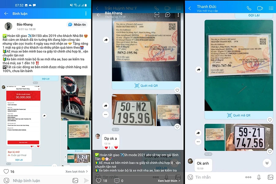 Tương tự, chị Trần Huỳnh Như Ý (ngụ tỉnh Long An) cũng bị lừa 40,5 triệu đồng khi mua xe tại fanpage “Xe máy nhập khẩu Bảo Khang”. “Tôi liên hệ mua xe SH Mode màu đỏ 2021 giá 25 triệu đồng vào ngày 17-1 và được yêu cầu chuyển cọc trước 3 triệu đồng. Bên đó hẹn tôi hai ngày sau nhận xe và cam kết giấy tờ chính chủ” - chị Ý kể.