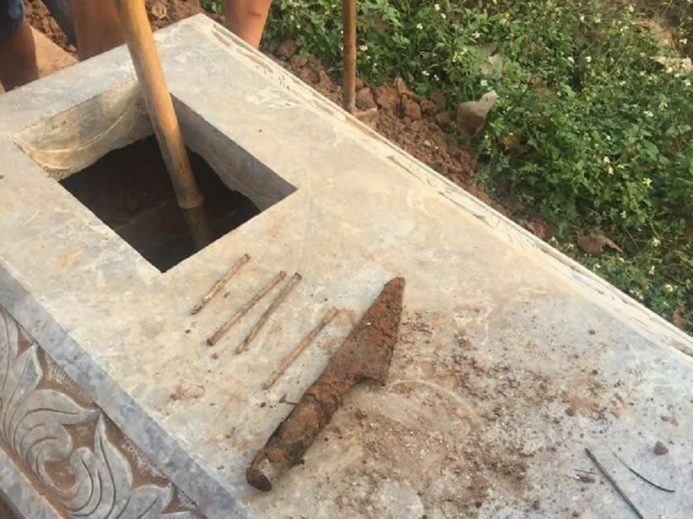 Tiến hành khai quật các ngôi mộ, lực lượng chức năng xã Sen Chiểu và gia đình ông H. phát hiện rất nhiều đinh (loại có chiều dài 10 cm), răng bừa, dao nhọn, cọc tre.