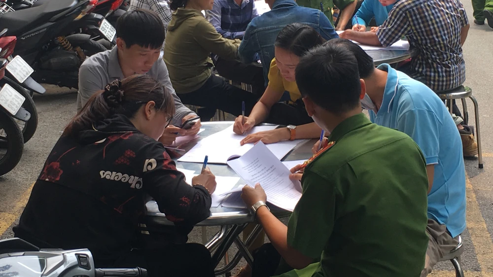 Công an hướng dẫn người dân trình báo trong khi dân tố cáo địa ốc Alibaba. Ảnh: N.Y