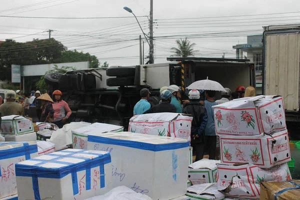 Vụ tai nạn cũng làm đã làm hơn 19 tấn trái cây đóng thùng trên xe tải 29C-45... đổ tràn xuống đường, vương vãi khắp nơi. Hàng chục người dân địa phương cùng lực lượng CSGT đội mưa gom hàng giúp tài xế, nhà xe. Sau gần một tiếng rưỡi đồng hồ, hầu hết hàng hóa đã được sắp xếp lại, đưa vào lề đường, góp phần giải phóng nhanh hiện trường, hạn chế ùn tắc giao thông.