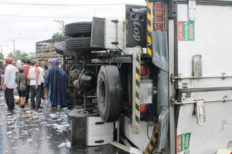 Lúc 12 giờ 30 ngày 11-12, trên quốc lộ 1 đoạn qua xã Cam Thành Bắc, huyện Cam Lâm (Khánh Hòa) xảy ra vụ tai nạn giao thông làm hai xe tải bị lật nghiêng.