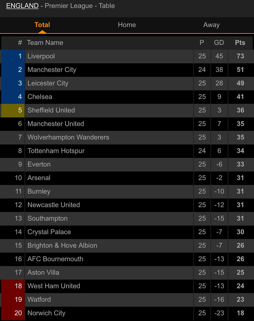 Với kết quả hòa 0-0, Arsenal có được vị trí thứ 10 với 31 điểm, xếp thứ 10 trên BXH, Burnley cũng có cùng điểm số với “Pháo thủ” nhưng xếp sau do kém hơn về hiệu số phụ. Ở vòng 25 Premier League, Liverpool tiếp tục bảo vệ ngôi đầu với chiến thắng 4-0 trước Southampton, trong khi đó Man. United hòa 0-0 trước Wolverhampton ngay trên sân nhà Old Trafford.
