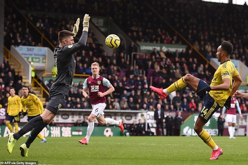 Aubameyang có cơ hội đối diện cầu môn Burnley lần hai nhưng thủ môn Nick Pope đã kịp lao ra cản phá.