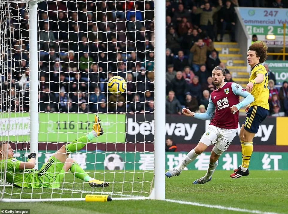 Aubameyang tiếp tục vô duyên trước cầu môn Burnley khi đánh đầu đi sượt cột dọc ở phút 76.