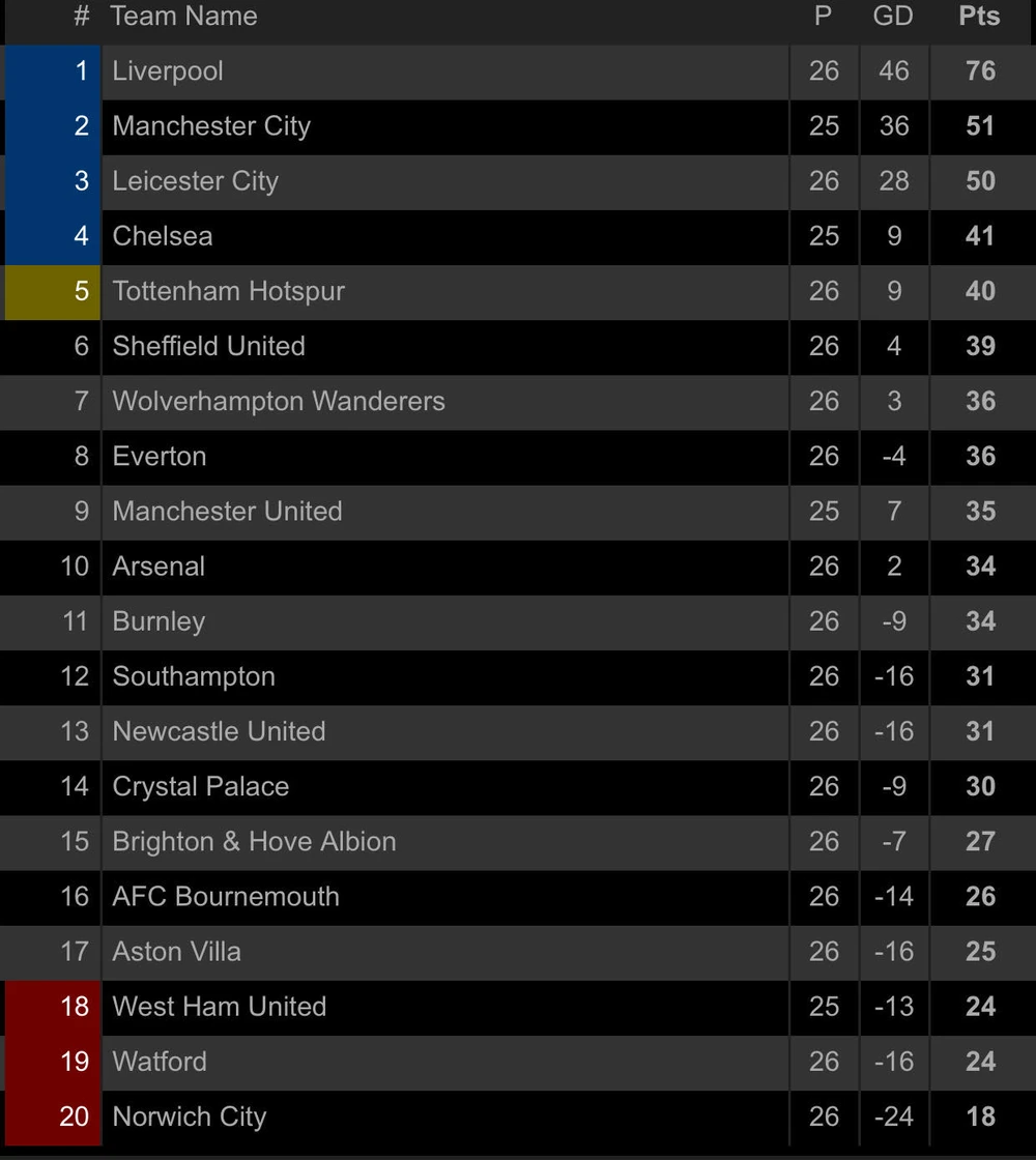Bảng xếp hạng Premier League: