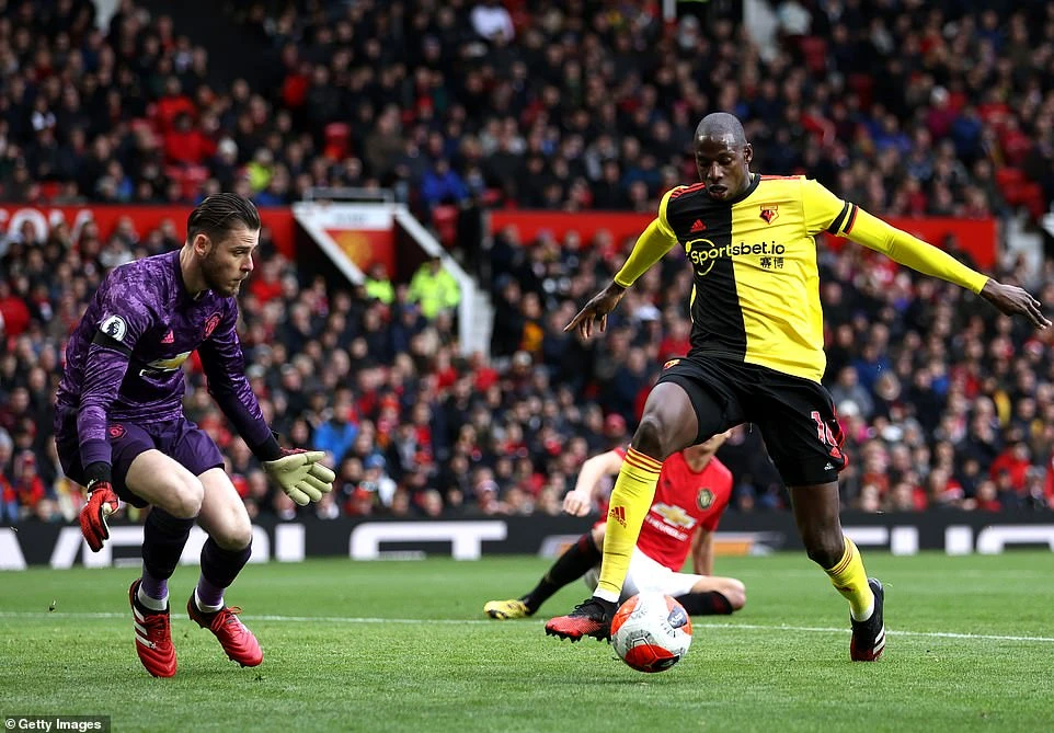 Phút 30, Watford có được tình huống phản công nhanh, tiền vệ Doucoure nhanh chân tung cú sút chéo góc trước vòng cấm đưa bóng đi sát cột dọc, thủ môn De Gea trong pha bóng này phải vất vả bay người mới cứu được cho MU bàn thua.