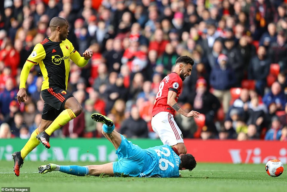 Hàng công của Man. United bế tắc trước lối chơi phòng thủ chặt chẽ của Watford, tuy nhiên bất ngờ xảy ra ở phút 40 khi tân binh Bruno Fernandes bị thủ môn Ben Foster đốn ngã trong vòng cấm giúp “Quỷ đỏ” được hưởng phạt đền. Trên chấm 11 m, Bruno Fernandes dễ dàng đánh lừa thủ môn Ben Foster để giúp Man. United kịp kết thúc hiệp 1 với lợi thế dẫn trước 1-0.
