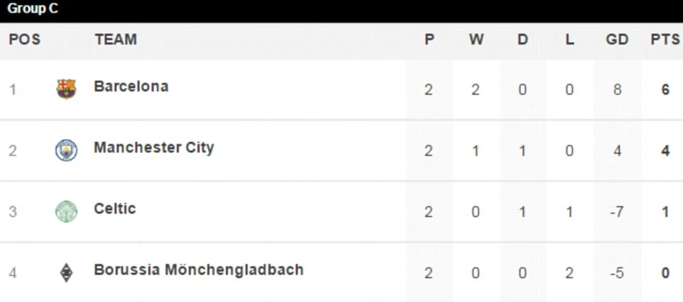 Như vậy sau 2 lượt đấu tại bảng C, Barcelona thắng cả hai trận đứng đầu bảng trong khi Monchengladbach toàn thua xếp ở vị trí cuối cùng. Man City xếp thứ 2 với 4 điểm còn Celtic đứng thứ 3 với 1 điểm.