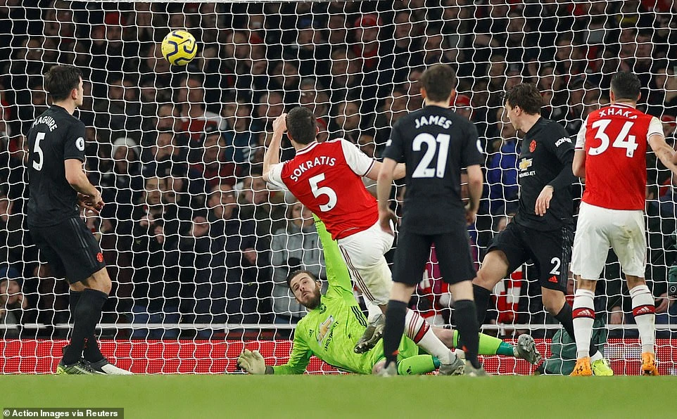 Trước sức ép quá lớn của Arsenal cùng với việc thủ môn De Gea chơi không ổn định, lưới của Man. United cũng phải rung lên lần hai ở phút 42. Xuất phát từ tình huống phạt góc của Nicolas Pepe, tiền đạo Lacazette bật cao đánh đầu, buộc thủ môn De Gea phải đổ người cứu thua. Tuy nhiên, pha cản phá của thủ môn De Gea lại đưa bóng tìm đến đúng vị trí của Sokratis, trung vệ của Arsenal dễ dàng nâng tỉ số lên 2-0 bằng pha dứt điểm cận thành.