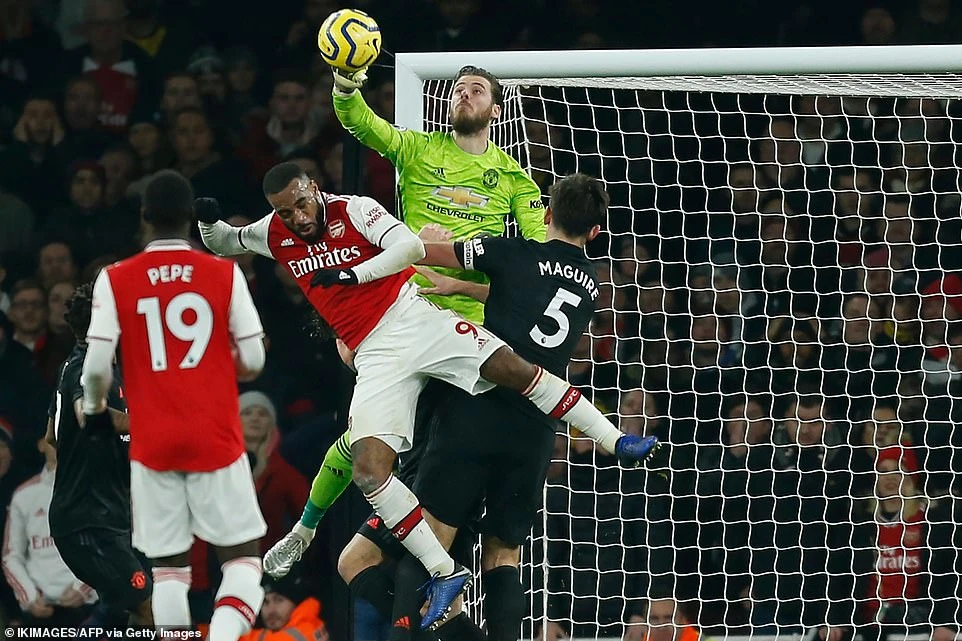 Hàng công của Arsenal thi đấu bùng nổ khiến thủ môn De Gea phải làm việc vất vả.
