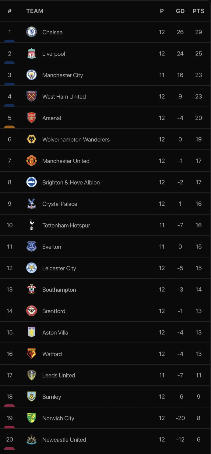 Với chiến thắng 4-0 trên sân nhà Anfield trước đối thủ Arsenal, Liverppol đứng vị trí thứ hai với 25 điểm sau 12 vòng đấu, kém đội đầu bảng Chelsea 4 điểm. Arsenal sau trận thua này đứng vị trí thứ 5 với 20 điểm.