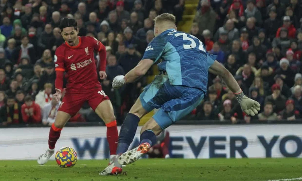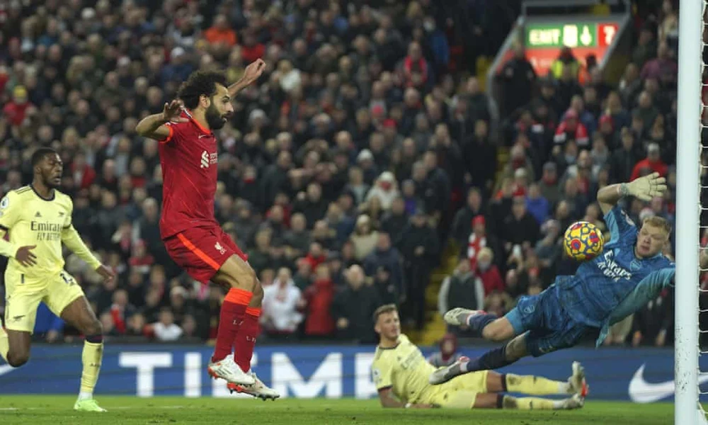 Liverpool làm chủ thế trận trong hiệp một với tỷ lệ kiểm soát bóng là 68%, nhưng phải đến phút 29 “the kop” mới có được cơ hội thực sự nguy hiểm. Từ đường tạt bóng bên cánh phải của Arnold, hậu vệ bên phía Arsenal đánh đầu giải nguy, bóng tìm đến vị trí của Thiago để cầu thủ người Tây Ban Nha tung cú sút khiến thủ môn Ramsdale không thể bắt gọn bóng. Ngay lập tức, Mane có pha băng vào đá bồi nhưng người gác đền bên phía “pháo thủ” đã kịp thời cứu thua.