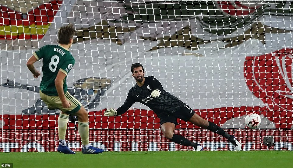 Tiền vệ Sander Berge dễ dàng đánh bại Alisson để mở tỉ số trận đấu. Ảnh PA.