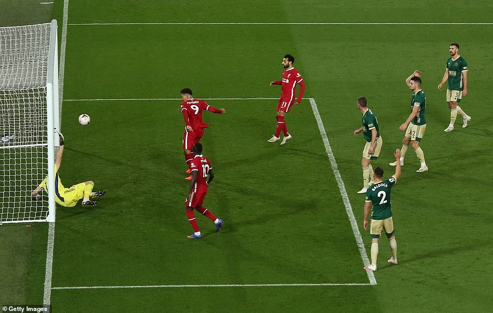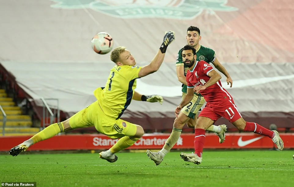 Pha đón bóng rồi dứt điểm của Salah làm rung lưới Sheffield United, nhưng bàn thắng không được công nhận do lỗi việt vị. Ảnh: Reuters.