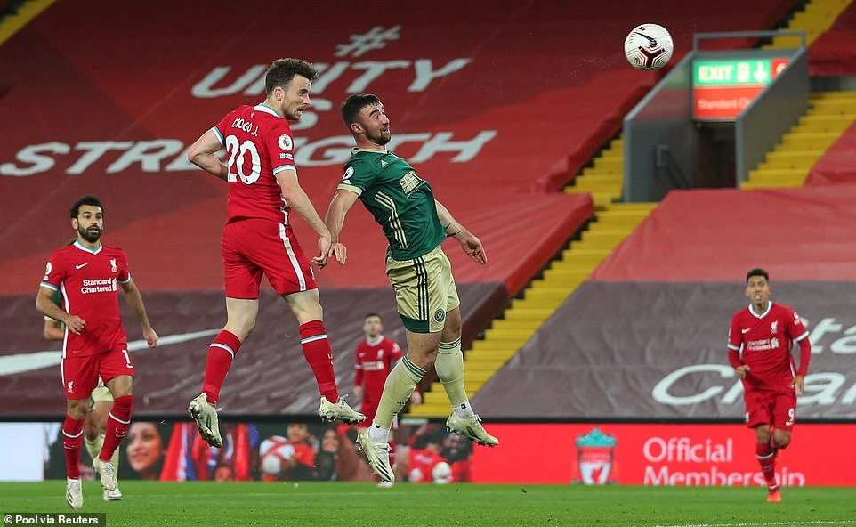 Đón pha tạt bóng vừa tầm của Mane, tiền đạo Diogo Jota bật cao đánh đầu mang về 3 điểm cho Liverpool. Ảnh: Reuters.