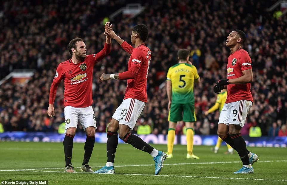 Ngay sau tiếng còi khai cuộc, các cầu thủ chủ nhà sớm tràn lên tấn công, các ngôi sao như Mata, Rashford và Martial thi nhau bắn phá khung thành của Norwich City.