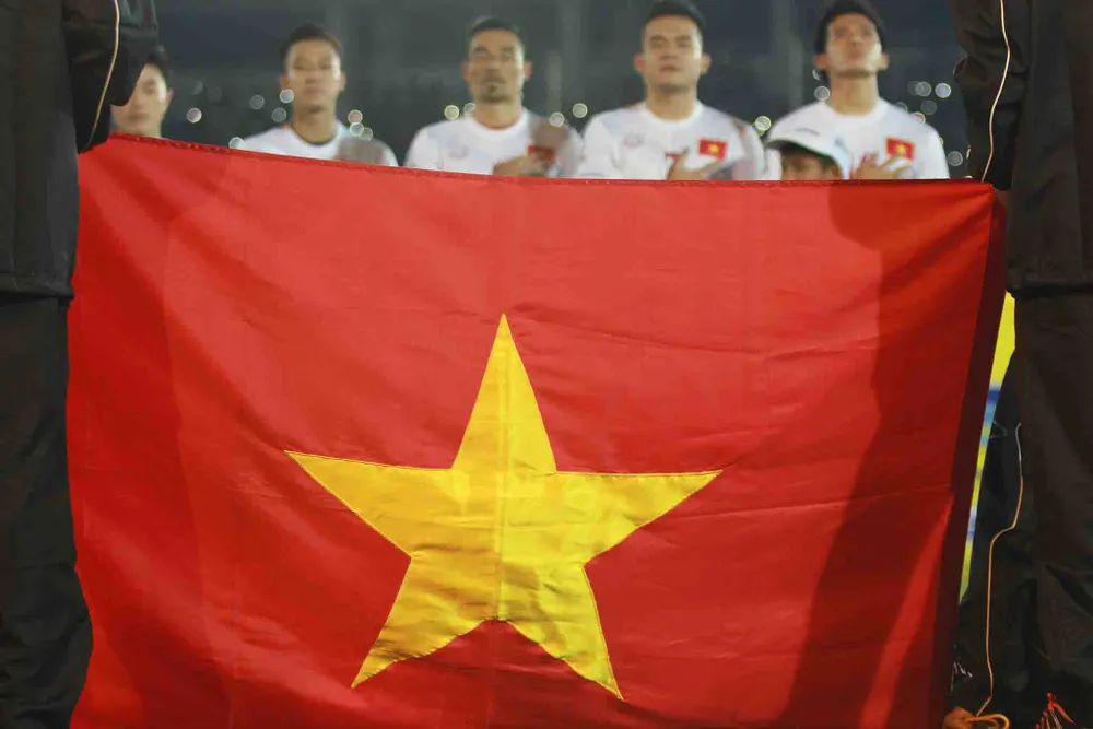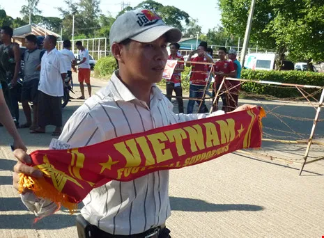 BTC sân không đồng ý cổ động viên Việt Nam đưa "đại kỳ" rộng 400 m vào sân, các cổ động viên Việt Nam đành chuyển sang phất quốc kỳ loại nhỏ. ẢNH: PHẠM HUY.