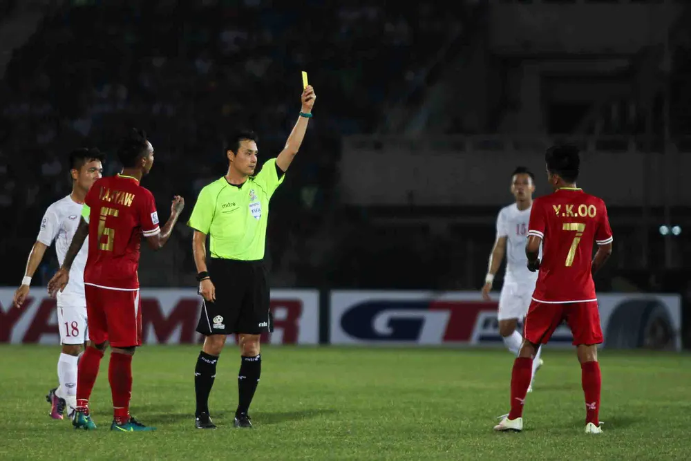 Ko Oo nhận thẻ vàng của trọng tài. ẢNH: PHẠM HUY.