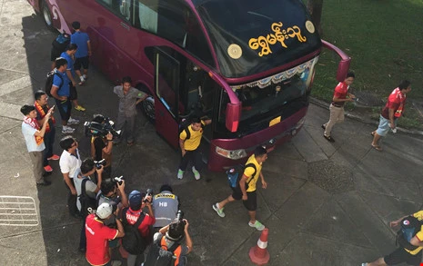 Các tuyển thủ Việt Nam đến sân Thuwanna được bảo vệ rất kỹ càng và an ninh. ẢNH: PHẠM HUY.