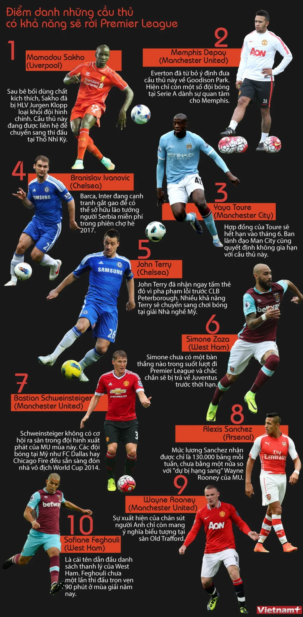 Kỳ chuyển nhượng mùa Đông 2017 đã chính thức mở cửa và Premier League đang đứng trước nguy cơ nhiều ngôi sao hàng đầu sẽ ra đi để đến chơi tại các giải đấu khác. Những cái tên đang nhận được sự quan tâm rất lớn từ các đội bóng có thể kể đến Alexis Sanchez, Wayne Rooney, Yaya Toure, Bastian Schweinsteiger.