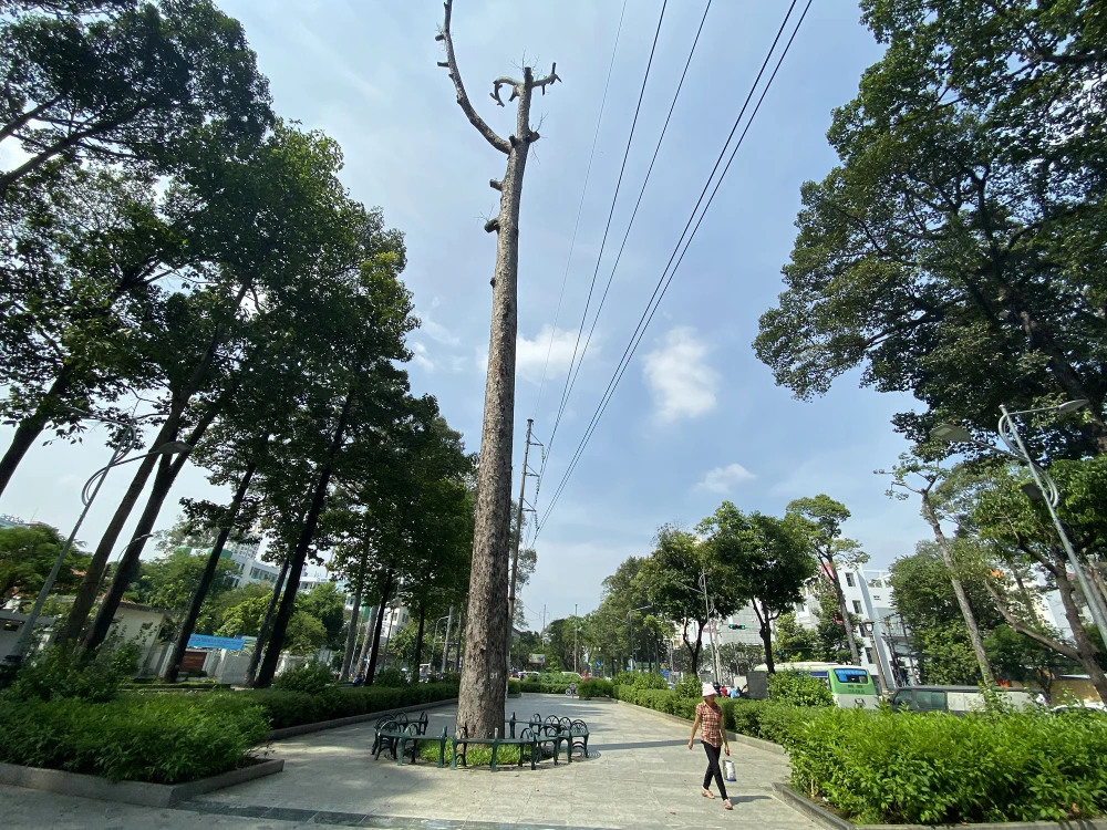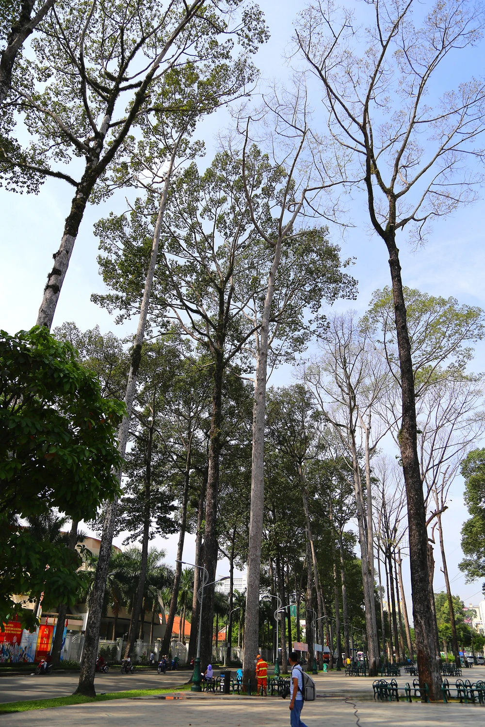 Có khoảng 10 cây cổ thụ thuộc họ dầu, lim xẹt đường kính khoảng 50 cm trụi lá, chết đứng giữa công viên.