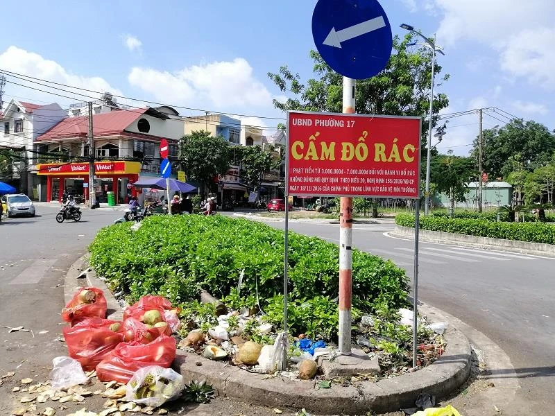 Khoảng 9 giờ ngày 8-7, chúng tôi ghi nhận rác thải xả tràn lan dọc tuyến đường Phạm Huy Thông, đặc biệt là phía khu chợ căn cứ K56. Mặc dù có biển cấm đổ rác nhưng ngay dưới biển báo là đống rác to của những xe ba gác bán dừa để lại.