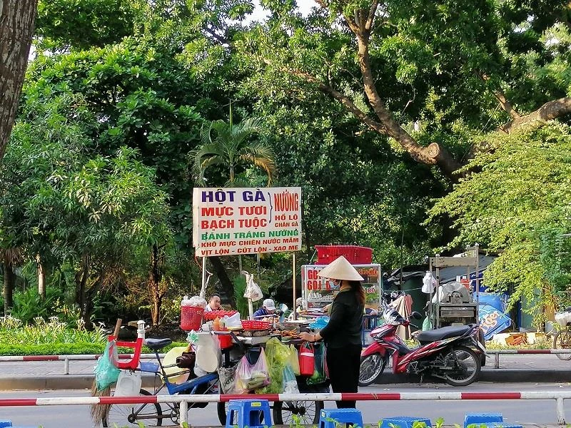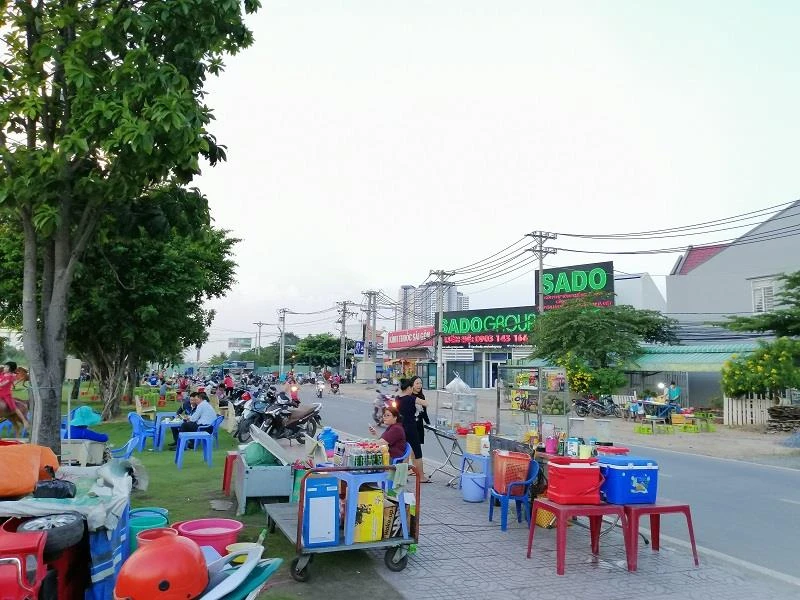 Hàng loạt hàng quán trên vỉa hè công viên ngã ba An Phú