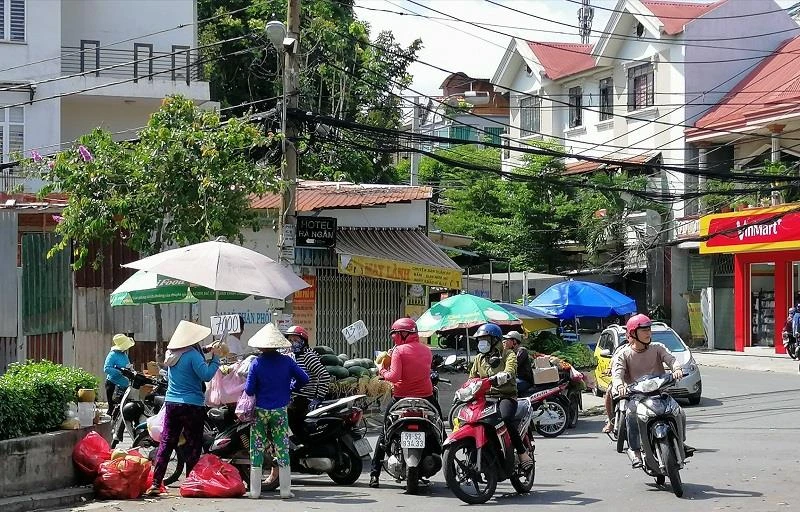 Những xe ba gác bán trái cây, người mua tấp nập lấn hết phần đường Phạm Huy Thông.