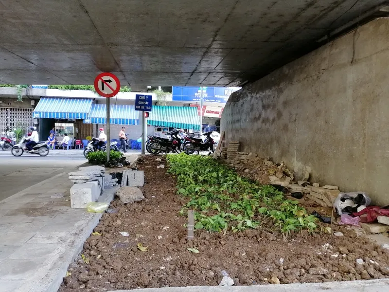 Vật dụng để tiến hành cải tạo mảng cây xanh còn vương vãi dưới dạ cầu.