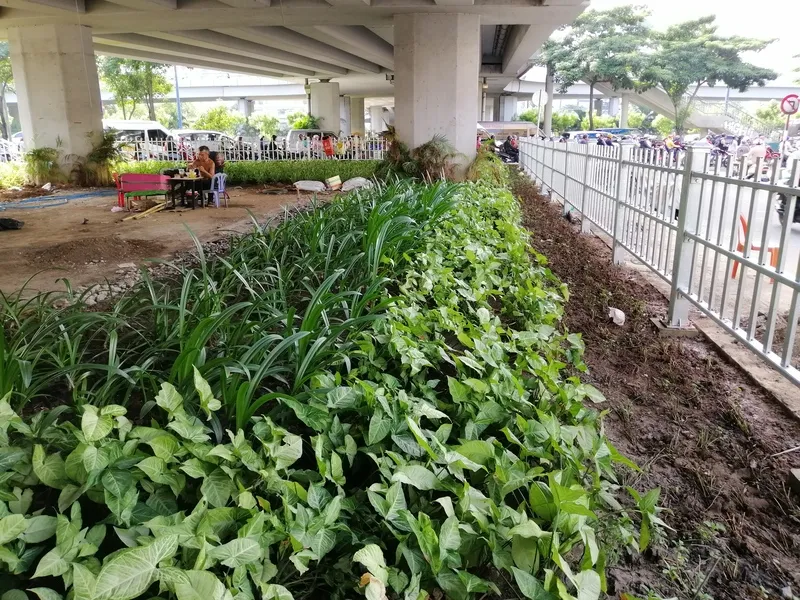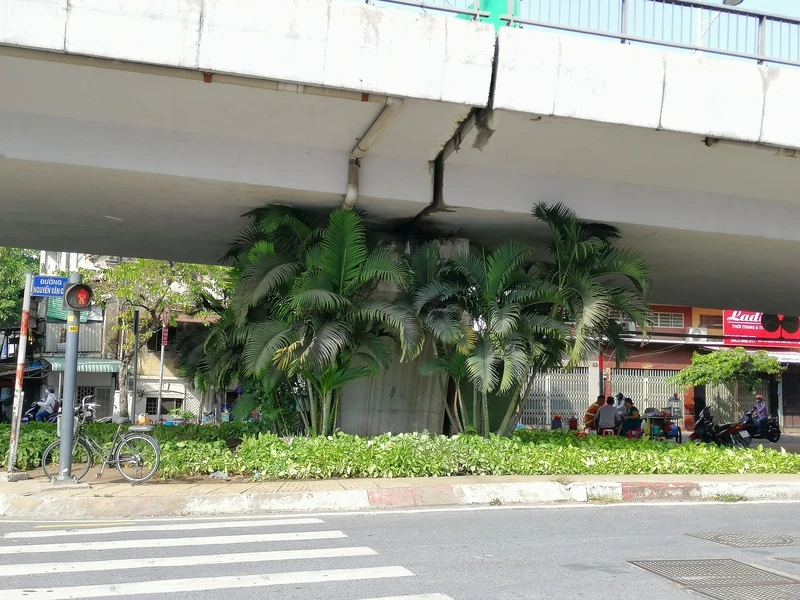 Mảng cây xanh xanh mát dưới dạ cầu Nguyễn Văn Cừ.