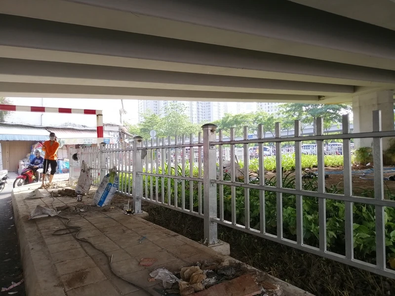 Công nhân đang nối các mối hàn của hàng rào phía ngoài.