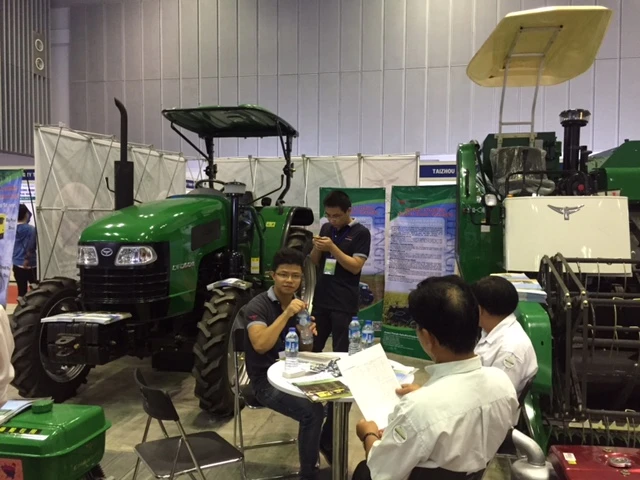 Máy cày có giá 10.000 USD và máy gặt 25.000 USD trưng bày tại hội chợ được người tìm hiểu.