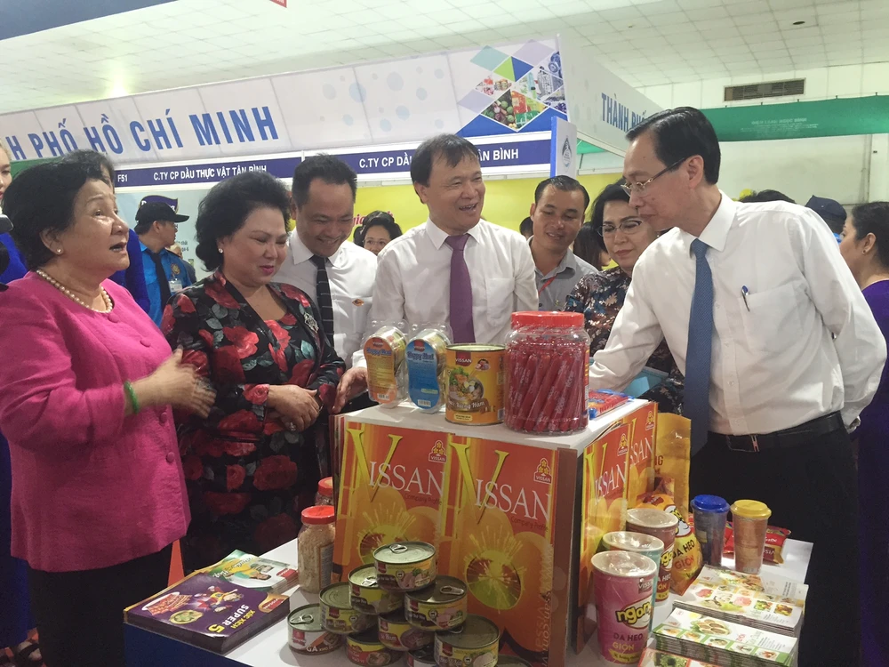 Phó Chủ tịch thường trực UBND TP.HCM Lê Thanh Liêm (bên phải ảnh) cùng Thứ trưởng Bộ Công Thương Đỗ Thắng Hải tham quan khu vực trưng bày sản phẩm chủ lực TP.HCM.