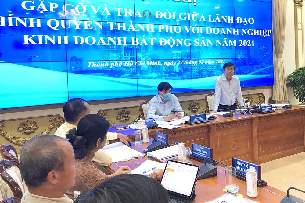Ông Nguyễn Thành Phong, Chủ tịch UBND TP.HCM, chỉ đạo giải quyết các vướng mắc của doanh nghiệp bất động sản tại hội nghị. Ảnh: QUANG HUY