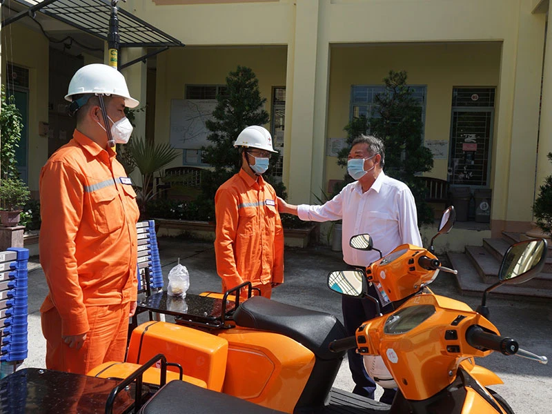 Ông Phạm Quốc Bảo thăm hỏi cán bộ, công nhân viên ngành điện trực đảm bảo điện tại các điểm tiếp xúc cử tri. Ảnh: ĐÀO TRANG
