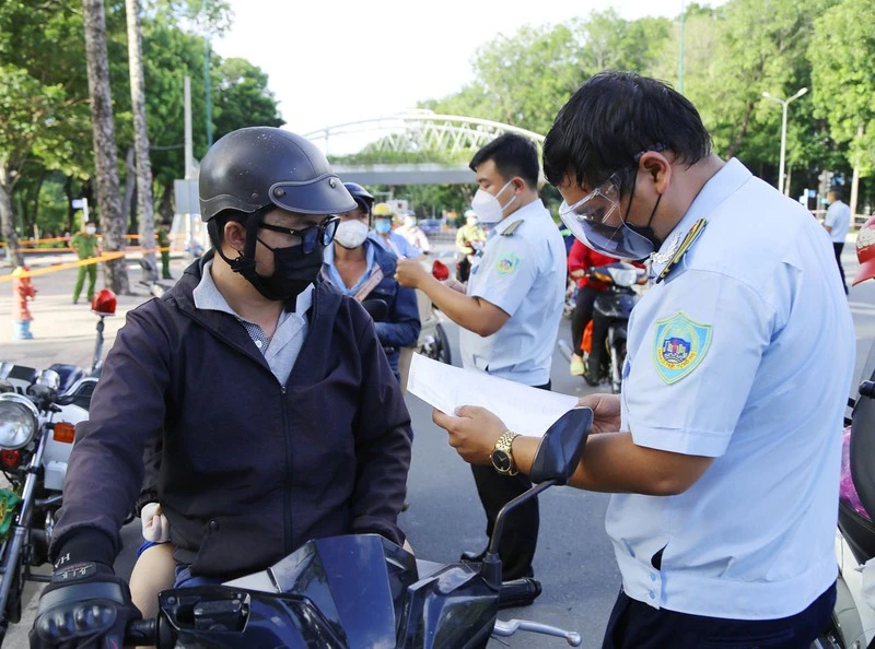Lực lượng chức năng kiểm tra giấy tờ người dân ra đường theo Chỉ thị 16 tại TP.HCM. Ảnh: HOÀNG GIANG