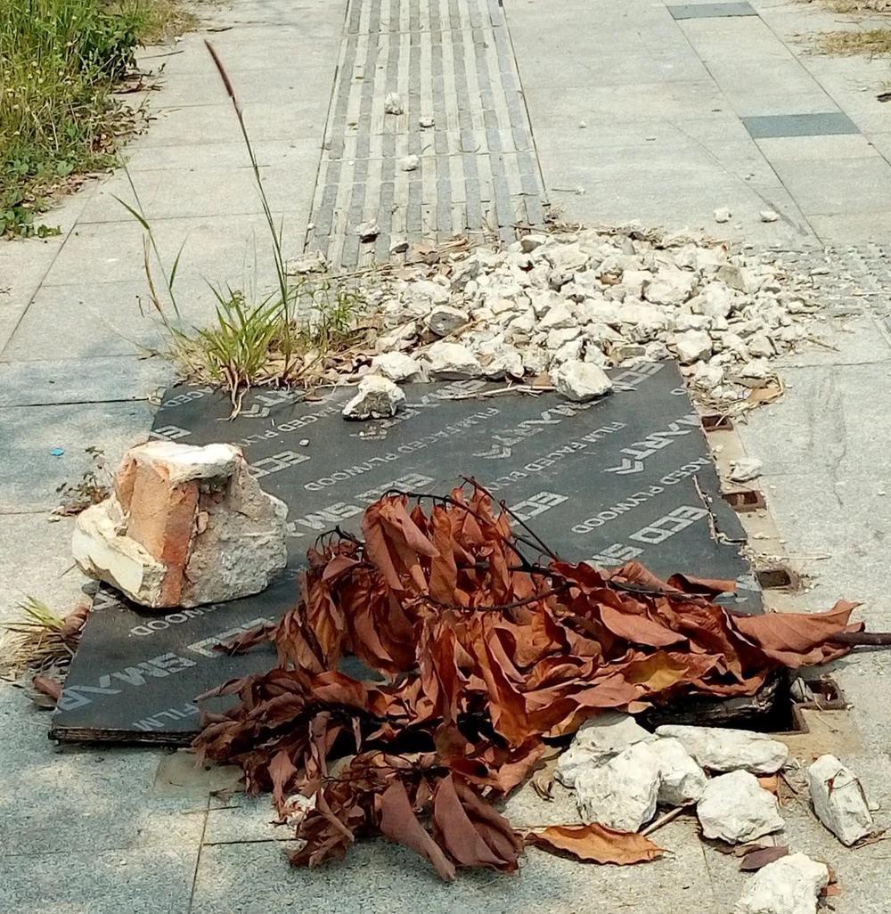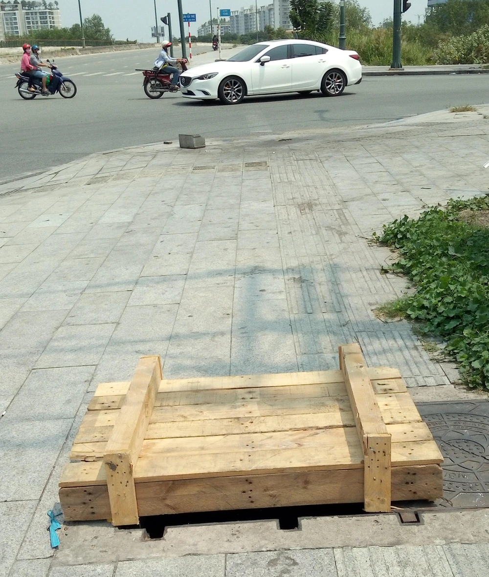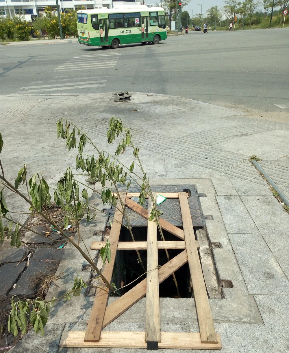 Hàng loạt hố ga trên đường Tố Hữu (phường Thủ Thiêm, TP Thủ Đức, TP.HCM) bị mất nắp đậy. Dù được che chắn tạm nhưng những hố ga mất nắp đậy này vẫn rất nguy hiểm cho người dân qua lại, nhất là vào ban đêm (ảnh chụp trưa 11 - 4).