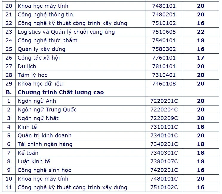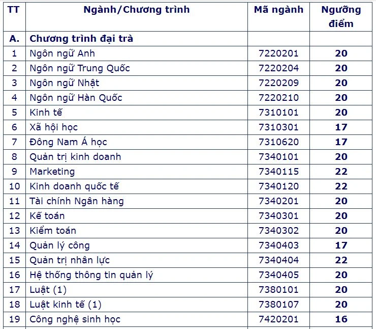 Theo đó, mức điểm dao động từ 16 đến 22 điểm. Trong đó, bốn ngành có mức sàn cao nhất năm nay là marketing, logistics và quản lý chuỗi cung ứng, kinh doanh quốc tế, quản trị nhân lực. Điểm sàn từng ngành như sau: