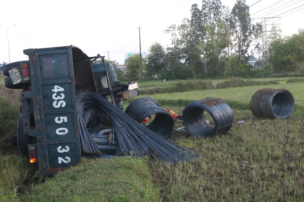 Sau va chạm, xe tải 43S-5032 mất lái chạy khoảng 200 m thì lao xuống ruộng lật nghiêng.