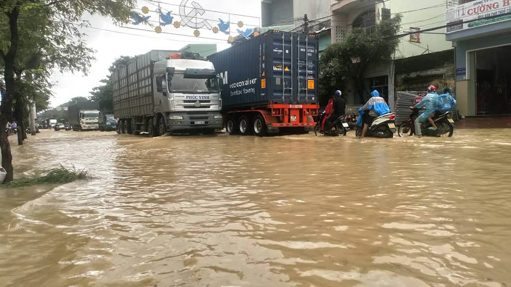 Đường Hùng Vương, TP Quy Nhơn bị ngập sâu trong nước. Ảnh: NO